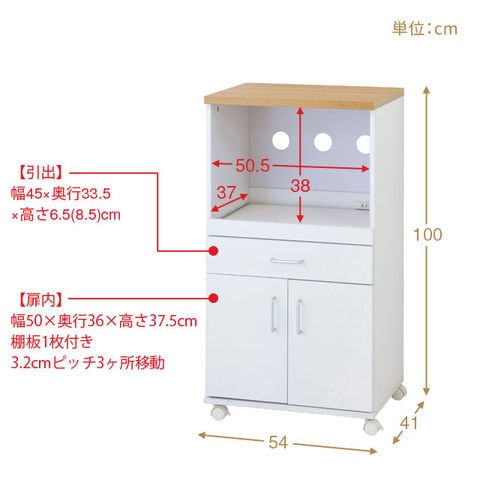 | サイズ | (約)幅54×奥行41×高さ100cm 上部引出内寸:(約)幅45×奥行33.5×高さ6.5(8.5)cm 扉内内寸:(約)幅50×奥行36×高さ37.5cm(棚板1枚付き、3.2cmピッチ3ヶ所移動) 上部空間:(約)幅50.5×奥行37×高さ38cm スライド棚:(約)幅48×奥行35cm |