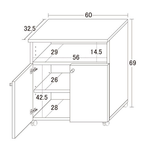 | サイズ | 幅60×奥行32.5×高さ69cm 空間内寸:幅56×奥行29×高さ14.5cm 扉内内寸:幅56×奥行28(26)×高さ42.5cm 可動棚1枚(空間・扉内ともに3cmピッチ3ヶ所移動) |