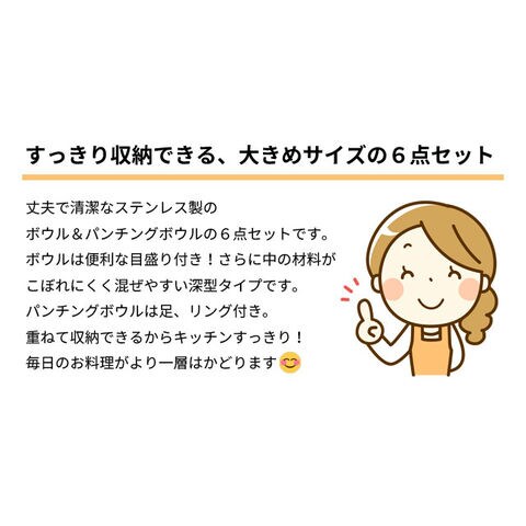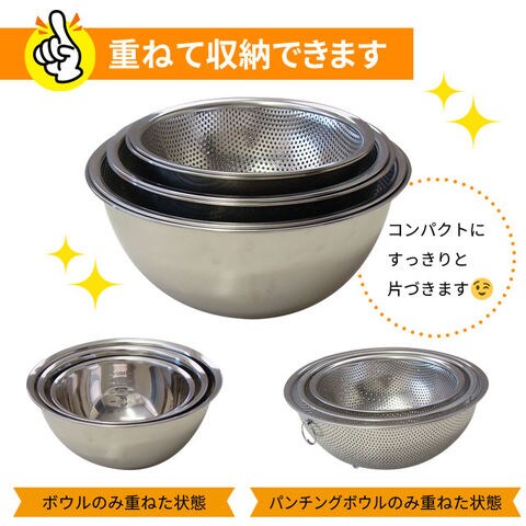 扱いが楽で傷つきにくい丈夫な材質のステンレス製品。 ボウルは便利な目盛り付き、中の材料がこぼれにくく、まぜやすい深型タイプ。パンチングボウルは足、リング付きです。ボウルとパンチングボウルは重ねて使えます。 |