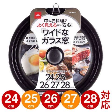 | ●ワイドガラス窓付きなので、焼き加減が全体的に見れます。 ●24cm・25cm・26cm・27cm・28cmの5サイズのフライパンに対応します。 ●ふっ素樹脂加工でお手入れ簡単! ●吊り下げて収納できるフック付き。 | |
