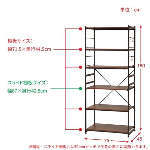 | サイズ | (約)幅75×奥行45×高さ180cm 棚板サイズ:(約)幅71.5×奥行44.5cm スライド棚板サイズ:(約)幅67×奥行42.5cm |