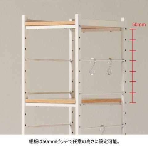 | 仕 様 | 棚板は50mmピッチで高さ調整が可能。 S字フック3個付き 耐荷重→全体:60kg 棚板:20kg スライド棚:10kg |