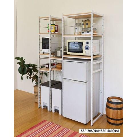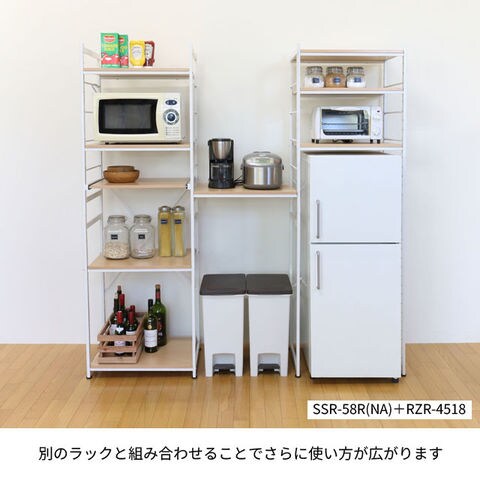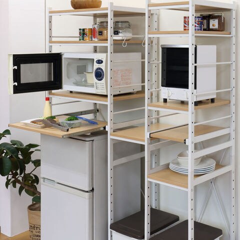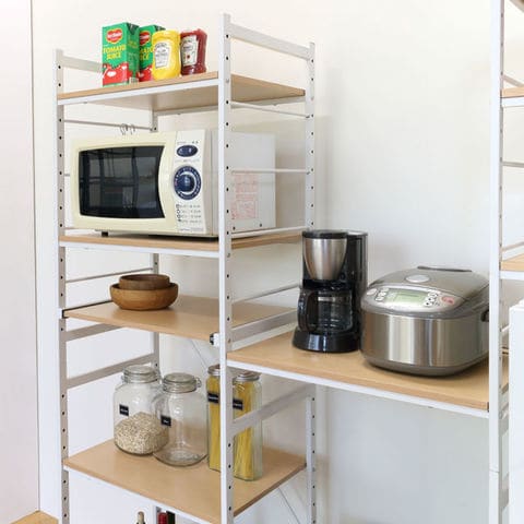 | たっぷり収納できるワイドタイプ。 棚板1枚はスライド式。炊飯ジャーなどの設置にも最適です。 棚板・スライド棚板共に50mmピッチで任意の高さに設定可能。 S字フックが3個ついているのでちょっとした物をサイドに掛けておくことができます。 脚はアジャスター脚になっています。 | |