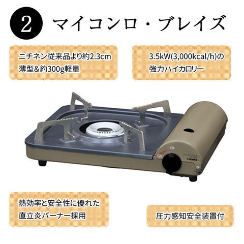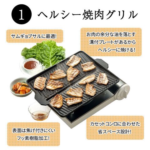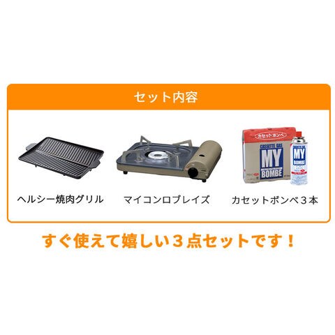| ・焼肉プレート(ヘルシー焼肉グリル) ・カセットコンロ(マイコンロ・ブレイズ) ・カセットボンベ3本(MYボンベ) |