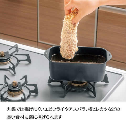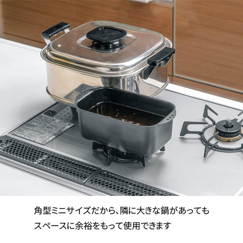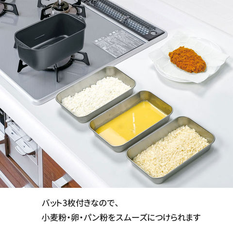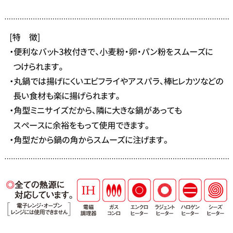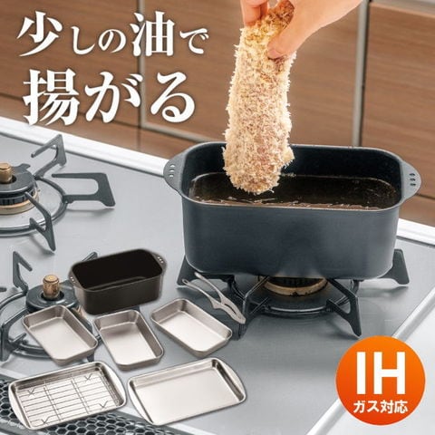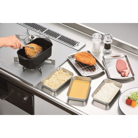 少量の油で料理が可能に。 お弁当や1~2人用など少量の調理に便利! ・便利なバット3枚付きで、小麦粉・卵・パン粉をスムーズにつけられます。 ・丸鍋では揚げにくいエビフライやアスパラ、棒ヒレカツなどの長い食材も楽に揚げられます。 ・角型ミニサイズだから、隣に大きな鍋があってもスペースに余裕をもって使用できます。 ・角型だから鍋の角からスムーズに注げます。 ・下ごしらえや取りわけに便利なステンレストング付き。 ・トレー2枚にアミまでついて下ごしらえなどの作業にピッタリ! |