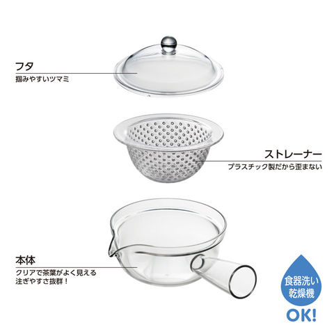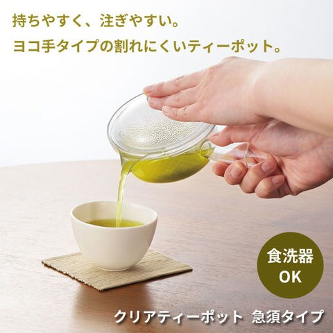 | ヨコ手タイプの割れにくいクリアティーポット登場!持ちやすく、注ぎやすい。一人分にちょうどいいサイズ。食器洗い乾燥機対応。 |