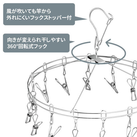 サビに強いステンレス製。 風が吹いても竿から外れにくいフックストッパー付き。 向きが変えられ干しやすい360°回転式フック。 |