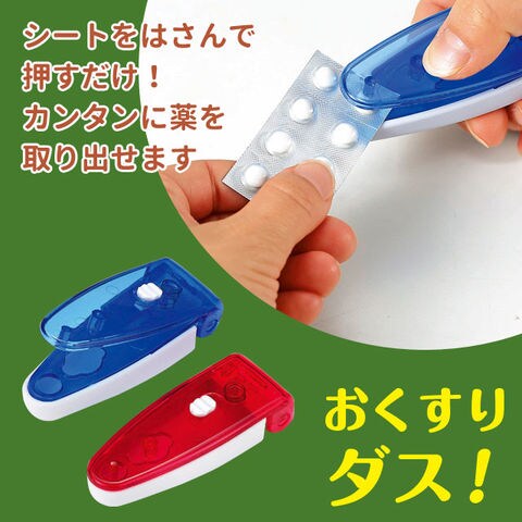 シートをはさんで押すだけ!カンタンに薬を取り出せます。 ◆大小の穴でいろんなお薬に対応!※一部対応していないお薬もありますのでご確認の上ご使用ください。 ◆コンパクトで持ち運びにも便利! |