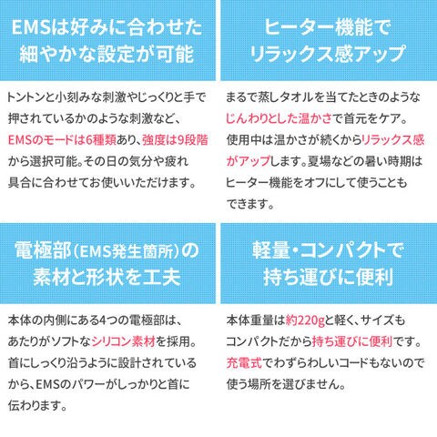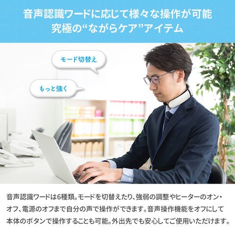 声で操作ができる首元専用リラクゼーションアイテム!EMSとヒーター機能で疲れた首にアプローチ 体装着後に電源ボタンを押したら、「モード切り替え」、「もっと強く」など決められたワードを話しかけるだけで反応し、リクエスト通りに操作変更を行う画期的なリラクゼーションアイテム。 首にかけるだけで、EMS(電気的筋肉刺激)でしっかりとアプローチ。ヒーターをオンにすれば、首元をじんわりと温めリラックス感がアップします。 職場やお出かけ先でも使いたくなる洗練されたデザイン 無駄のないシンプルなデザインにモノトーンなベーシックカラー。ご自宅からそのまま首にかけて外出しても大丈夫。持ち歩きデバイスのひとつとして是非ご活用ください。 音声認識ワードに応じて、さまざまな操作が可能。究極の「ながらケア」アイテム 音声認識ワードは6種類。モードを切替えたり、強弱の調整やヒーターのオン・オフ、電源のオフまで自分の声で操作ができます。音声操作機能をオフにして本体のボタンで操作することも可能。外出先でも安心してご使用いただけます。 両手が開放されているので、オフィスでパソコンを打ちながら、家で洗濯物をたたみながらと、さまざまなシーンで活用でき時間も有効に使える優れもの。 EMSは好みに合わせた細やかな設定が可能 トントンと小刻みな刺激やじっくりと手で押されているかのような刺激など、EMSのモードは6種類あり、強度は9段階から選択可能。その日の気分や疲れ具合に合わせてお使いいただけます。 ヒーター機能でリラックス感アップ まるで蒸しタオルを当てたときのようなじんわりとした温かさで首元をケア。使用中は温かさが続くからリラックス感がアップします。夏場などの暑い時期はヒーター機能をオフにして使うこともできます。 電極部(EMS発生箇所)の素材と形状を工夫 本体の内側にある4つの電極部は、あたりがソフトなシリコン素材を採用。首にしっくり沿うように設計されているから、EMSのパワーがしっかりと首に伝わります。 軽量・コンパクトで持ち運びに便利 本体重量は約220gと軽く、サイズもコンパクトだから持ち運びに便利です。充電式でわずらわしいコードもないので使う場所を選びません。 |