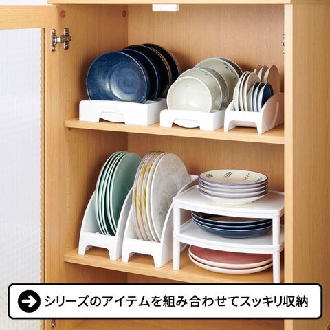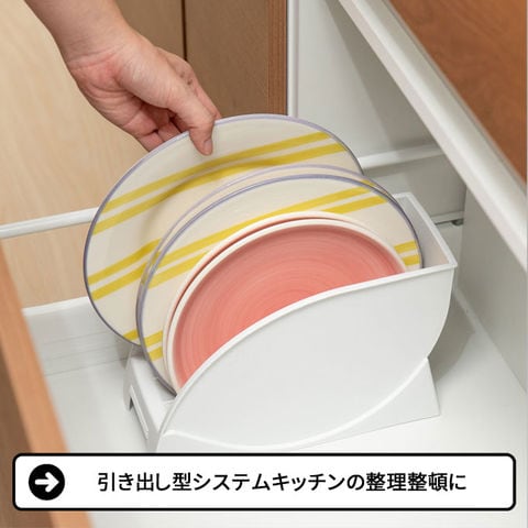 食器棚の中をスッキリ収納 お皿を立てて、省スペースに収納!使いたいお皿がサッと取り出すことができます。 直径24cmまでの大皿を収納できます。 お手入れ簡単 プラスチック製なので、水洗いできてお手入れ簡単です。 使いたいお皿がサッと取り出せる スタンドごと引き出してラクにお皿が取り出せます。 引き出し型システムキッチンの整理整頓に 食器を立てて引き出し内に収納することができます。 組み合わせてスッキリ収納 食器棚収納シリーズを組み合わせればスッキリ収納できます。 |
