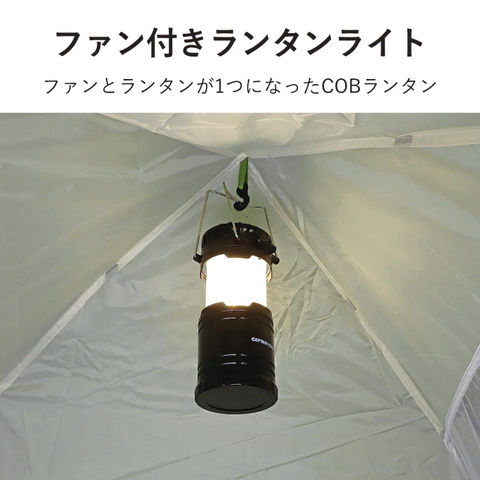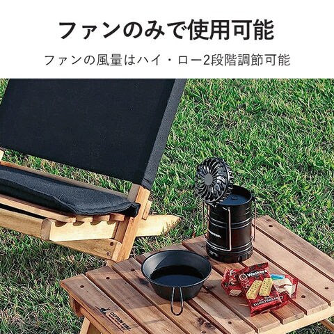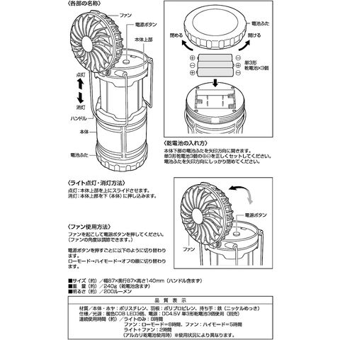 | 明るさ/(約)200ルーメン、光源/暖色COB LED3個、電源/DC4.5V 単三形乾電池3個使用(別売)、連続使用時間/ライトのみ=約8時間、ファン=ローモード約8時間、ファン=ハイモード約5時間、ライト+ファン/約2時間(アルカリ乾電池使用時)※使用状況により異なります。 |