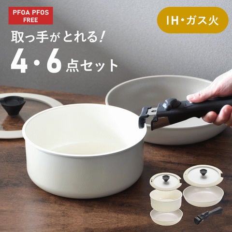 品番:P01-1-80-tortino-4P-A※品名:フライパン 鍋 セット 白 取っ手が取れる 蓋付き ih フライパンセット 20cm 26cm 深型 ガス火 IH対応 軽量 軽い 福袋 一人暮らし 調理器具 セット ふた フタ ガラス蓋 炒め鍋 いため鍋 中華鍋