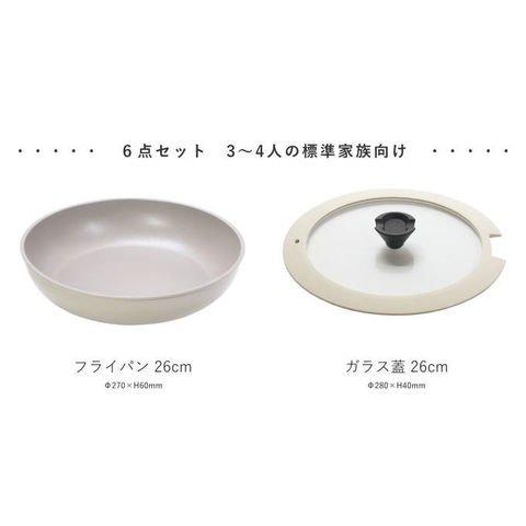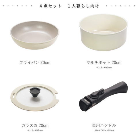 | 【4点セット】 1.フライパン20cm 2.マルチポット20cm 3.ガラス蓋20cm 4.専用ハンドル 【6点セット】(+4点セット内容) 5.フライパン26cm 6.ガラス蓋26cm |