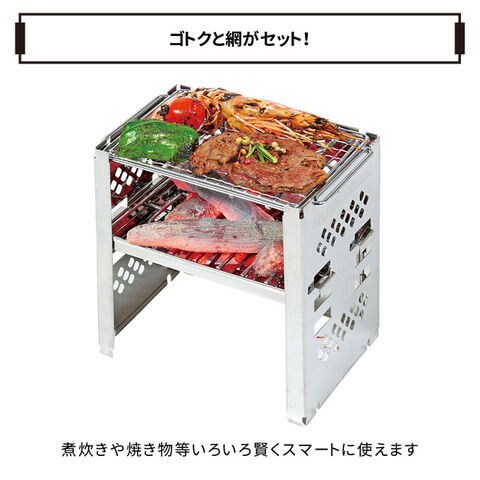 ゴトクとアミがセット。煮炊きや焼き物等、いろいろ賢くスマートに使えます。 収納はB5サイズでコンパクト。ツーリング、お一人様キャンプに最適。 本体は錆びにくいステンレス製。 収納・持ち運びに便利な収納バッグ付。 ネジを使用していないのでドライバー不要で組立簡単。 燃料や用途に合わせて炭受けの高さが3段に調整可能。 |