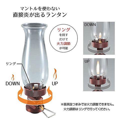 マントルを使わない直接炎が出るランタンです。 リングを回すだけで火力調節が可能です。 収納や携帯に便利なハードタイプの専用ケース付き。 |