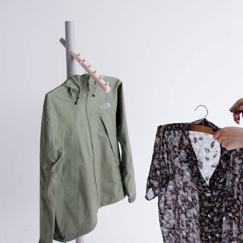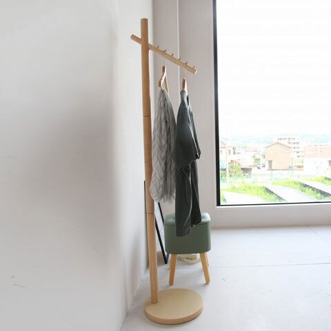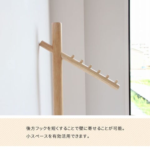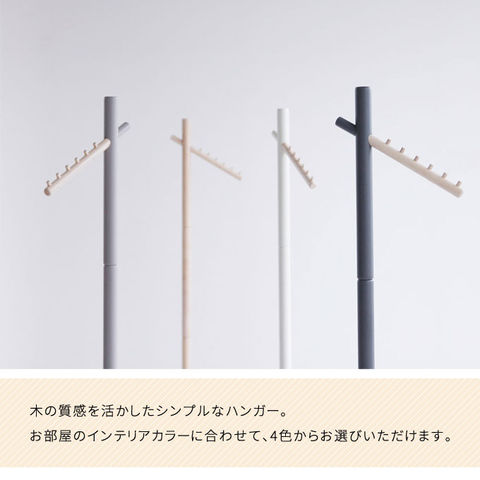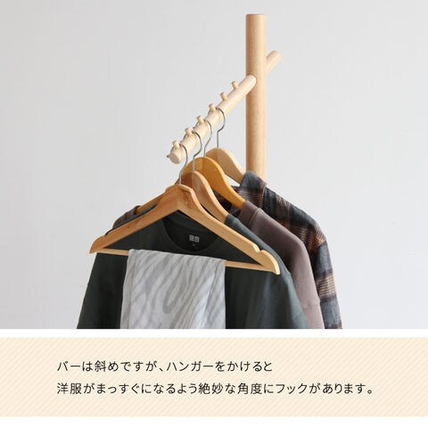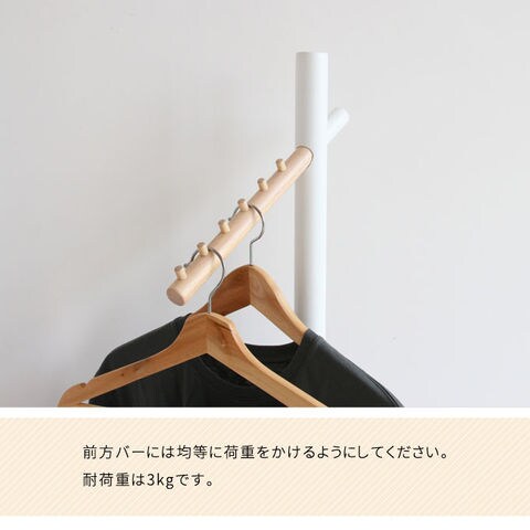 木の質感を活かしたシンプルなハンガー。 お部屋のインテリアカラーに合わせて、ホワイトとナチュラル、グレージュ、ダークグレーの4色からお選びいただけます。 6段の木製フックがすべり止めになります。 斜めのバーが特徴的で、壁側やデッドスペースにすっきり置くことができます。 バーは斜めですが、ハンガーをかけると洋服がまっすぐになるよう絶妙な角度にフックがあります。後方フックを短くすることで、壁に寄せることが可能、小スペースを有効活用できます。 前方バーには均等に荷重をかけるようにしてください。 耐荷重は3kgです。 ベースに支柱を取り付け、前方バーと後方フックで固定するだけの簡単組み立てです。 |