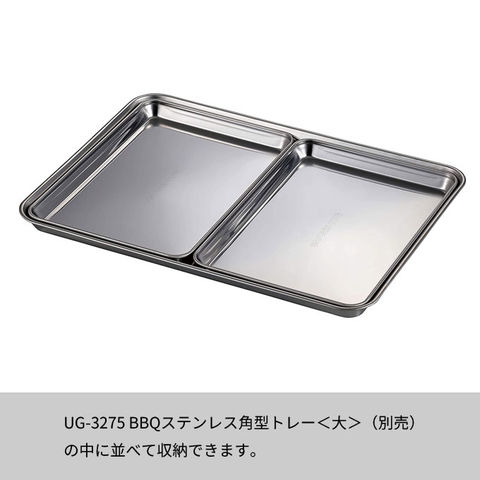 料理の下ごしらえに便利なステンレス製角型トレー。 カマド スマートグリル B6型(別売)の炭受けとして使えます。 UG-3275 BBQステンレス角型トレー<大>(別売)の中に並べて収納できます。 カマド スマートグリル B6型が、収納バッグごとトレーに収まります。 |