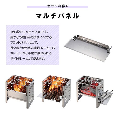 煮炊きや焼き物等、いろいろ賢くスマートに使えるカマド スマートグリル B5に便利なアイテムが3点付いたお得な4点セットです。 ※すべて同時に収納袋に入りません。角型トレーかグリルプレートどちらかを収納できます。 【カマドスマートグリル B5型】 収納はB5サイズでコンパクト。ツーリング、お一人様キャンプに最適。本体は錆びにくいステンレス製。収納・持ち運びに便利な収納バッグ付。ネジを使用していないのでドライバー不要で組立簡単。燃料や用途に合わせて炭受けの高さが3段に調整可能。 【グリルプレ―ト】 ライパンより厚みがあり熱をじっくり均等に伝えます。調理してそのまま食卓にご家庭でも使用可能。オーブンも使用可能。 【角型トレー】 料理の下ごしらえに便利なステンレス製角型トレー。カマド スマートグリル B5型(別売)や、小型グリルの炭受けとして使えます。カマド スマートグリル B5型が、収納バッグごとトレーに収まります。衛生的なステンレス製。冷蔵庫やクーラーボックスで一時保管する食材用トレーとしても使えます。 【マルチパネル】 カマド スマートグリルB5型専用、1台3役のマルチパネル。薪などの燃料をこぼれにくくするフロントパネル、長い薪を使う時の補助トレー、カトラリーなど小物が乗せられるサイドトレーとして使えます。錆びにくいステンレス製です。 |