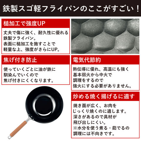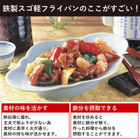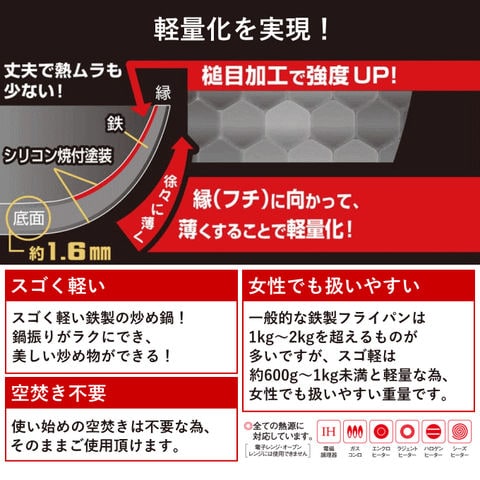 | スゴく軽い鉄製の炒め鍋。鍋振りがラクにでき美味しい炒めものができる フチに向かって薄くするスピン仕上げで軽量化 ラベル内面にイラスト入りの「鉄のガイド」付き あらゆる熱源に対応 (ガスコンロ、電磁調理器 (IH 100V・200V 対応)、ハロゲンヒータ、ラジエントヒータ、シーズヒータ、エンクロヒータ) |