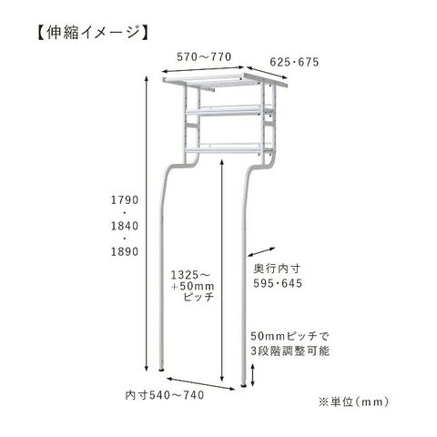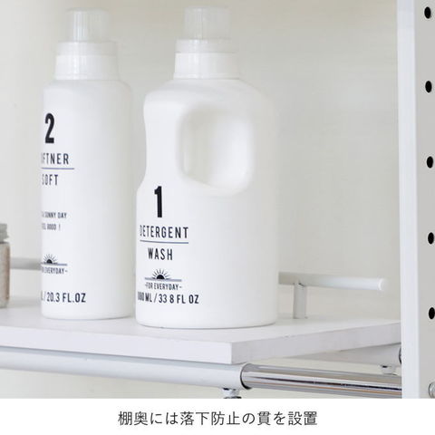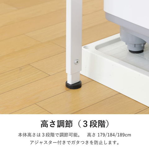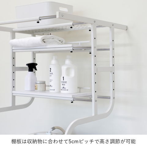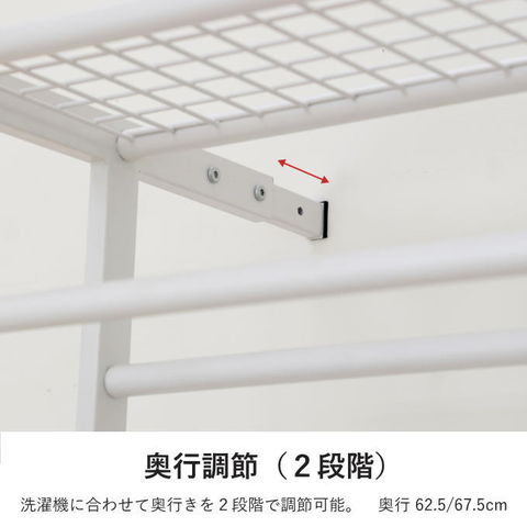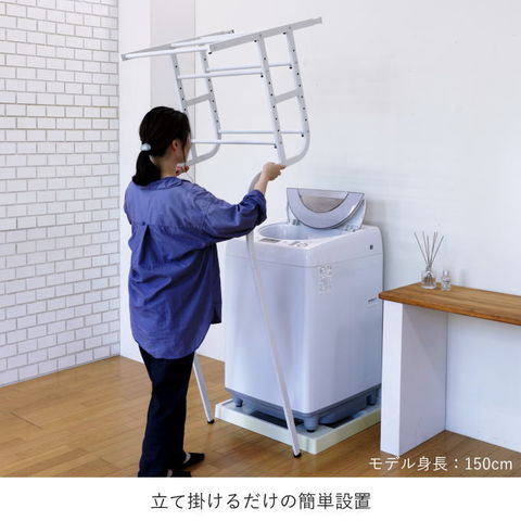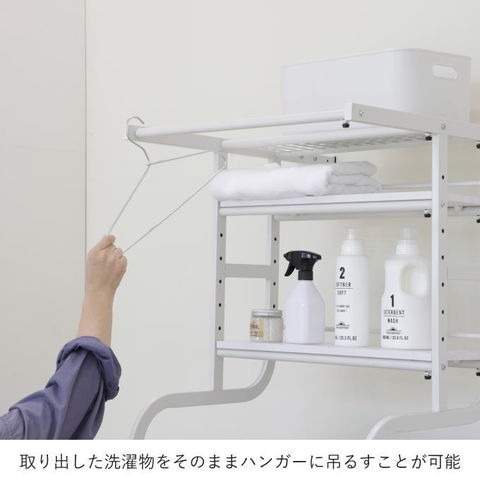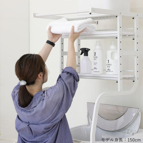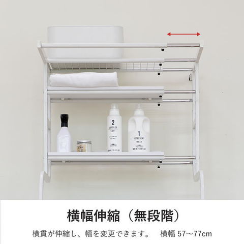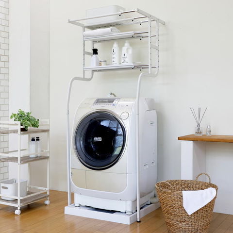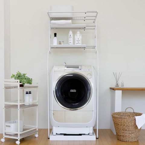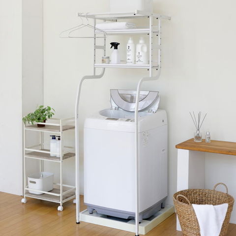 | 先に洗濯機が置いてあっても、設置可能な立て掛け式、伸縮するランドリーラックです。 洗濯機に合わせて幅・奥行き・高さを調節することが可能です。 脚は防水パンの前にも横にも設置することができ、単身者向けのアパートなど設置スペースの狭いシーンでも活躍します。 棚板の背面には落下防止のストッパーがあります。 最上部にはサッとかけられるちょい干しポール(物干し竿)付き。 |