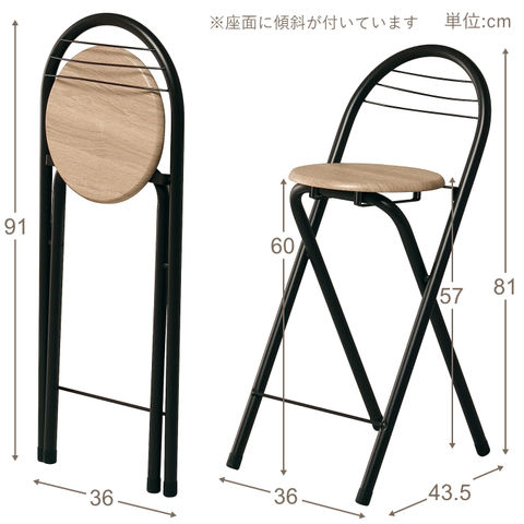 | 組立サイズ:幅36x奥行43.5x高さ81cm(座面高さ58cm) 座面高さは約58cmで約90cm前後の高さのテーブルやカウンターと合います。 収納サイズ:幅36x奥行8x高さ91cm 約9cmのスキマに収納できます。 |