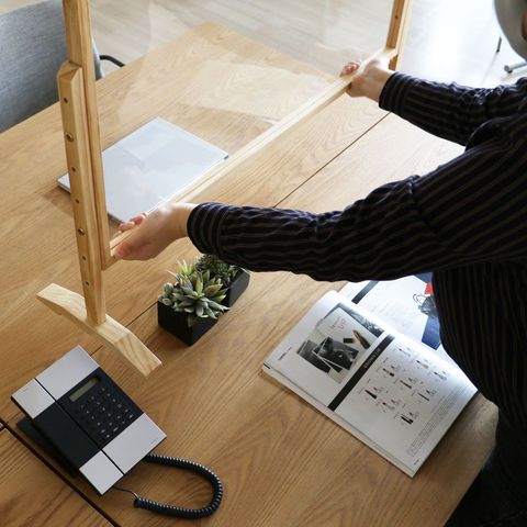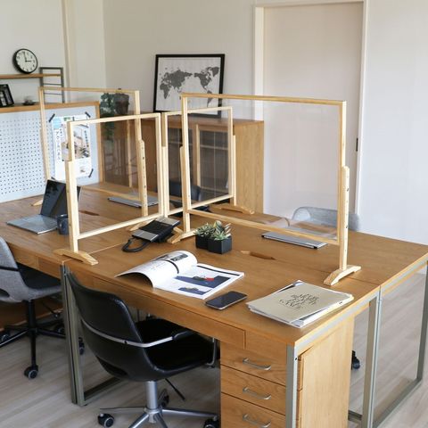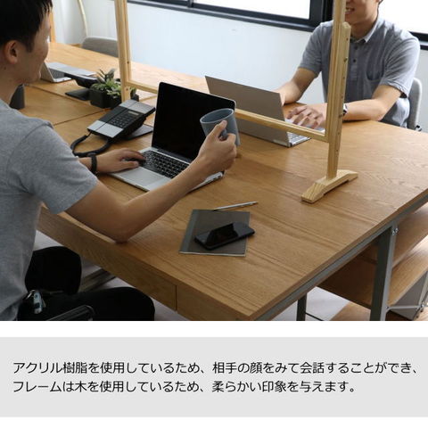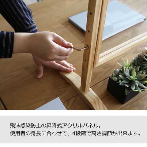 | 飛沫感染防止の昇降式アクリルパネル。 使用者の身長に合わせて、高さ調節が出来ます。 アクリル樹脂を使用しているため、相手の顔をみて会話することができ、 フレームは木を使用しているため、柔らかい印象を与えます。 |