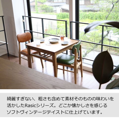| 綺麗すぎない、粗さも含めて素材そのものの味わいを活かしたRasicシリーズ。 どこか懐かしさを感じるソフトヴィンテージテイストに仕上げています。 ダイニングでもデスクでも、場所を気にせず使用ができる1人掛けチェアです。 |
