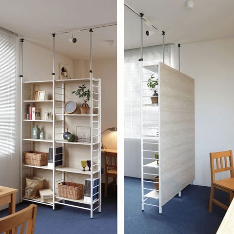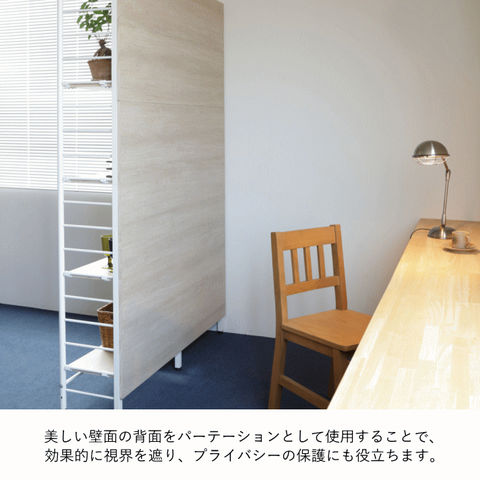 | どうしても出来てしまうデッドスペースにも、有効に活用することでライブスペースに。突っ張りポールにボードやラックを詰め込んだ壁面収納ファニチャーが、空間を美しく機能的に変身させてくれます。 棚は100cmピッチで高さ変更が可能です。フックが互い違いになっているので、隣の棚を同じ 段にすることができます。 ※あらかじめ設置場所の天井および床面の強度をご確認下さい ※天井固定用ネジは付属していません。 |