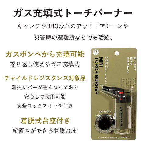| 強い火力でレジャーや災害時に大活躍!繰り返し使える便利なガス充填式 普通のライターに比べ強い火力を持つコンパクトバーナーです。 キャンプやBBQなどのアウトドアシーンや災害時の避難所などでも活躍。 CR(チャイルドレジスタンス)対象品。安心してお使いいただけます。 安全スイッチ着火ON・OFFロック付き。 ※ボンベは別売りです |