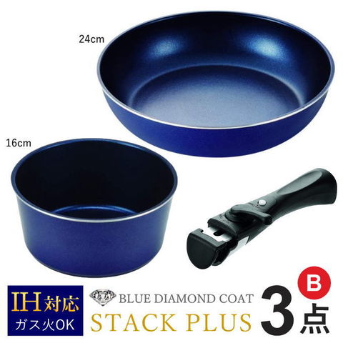 フライパン 3点 セット B IH対応 ガス火兼用 ブルーダイヤモンドコート パール金属 取っ手が取れる スタックプラス 24cmフライパン ハンドル マルチポット16cm