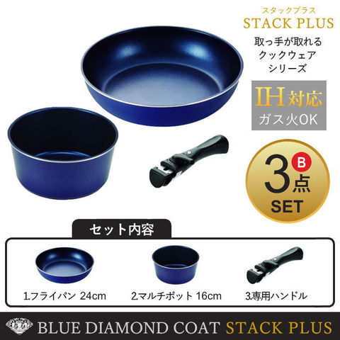 スタックプラス ブルーダイヤモンドコーティング 取っ手が取れるフライパン3点セットBの解説の詳細