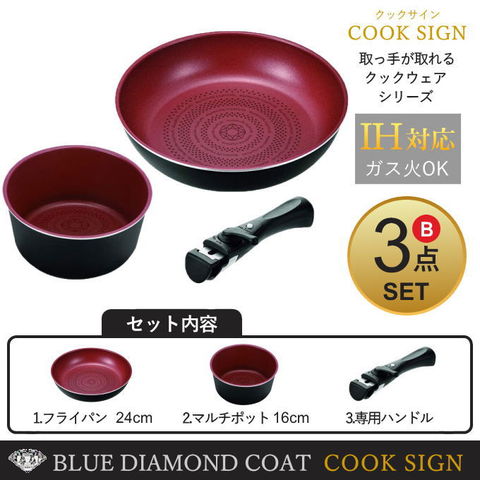 【期間数量限定SALE】フライパン 3点 セット B IH対応 ガス火兼用 ブルーダイヤモンドコート パール金属 取っ手が取れる クックサイン 24cmフライパン ハンドル マルチポット16cm HB-5620