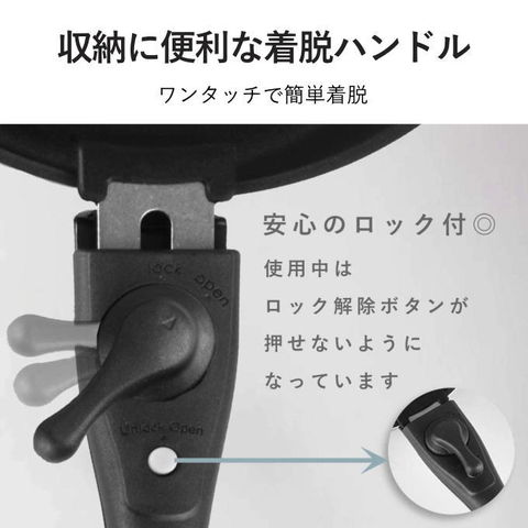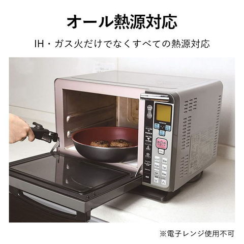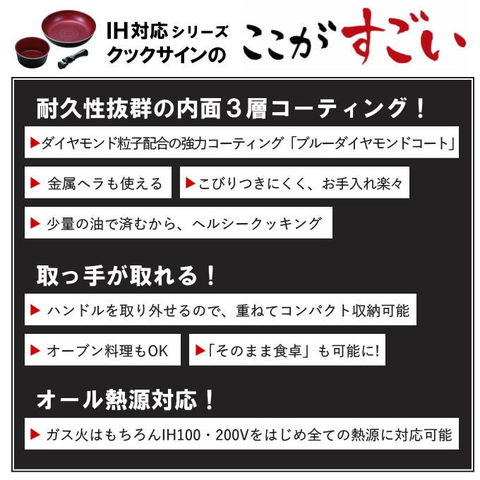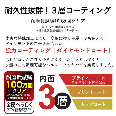 | 【新機能】調理開始を模様でお知らせ! 加熱すると内面に模様が出てくるので調理開始の適温が分かります。 一目でタイミングが分かって便利です。 ルクスパンシリーズと併用できます。 耐久性抜群!内面3層コーティングのフライパン 耐摩耗試験100万回クリア※JIS S 2010試験に準ずる(日用金属製品検査センター調べ) ダイヤモンド粒子を配合した内面は3層コーティング(トップコート・プリントコート・プライマーコート(ダイヤモンド粒子配合))で、丈夫かつお手入れも簡単です。 汚れやコゲがこびりつきにくく、少量の油で調理いただけます。耐久性も抜群です。 オーブン調理もOK!そのまま食卓に運べます! また、少量の油で調理可能なヘルシークッキングを実現しました。 収納に便利な着脱ハンドル式 外せるハンドル!取っ手が取れてコンパクト! 基本的な調理が全てできるフライパン・鍋のセット商品です。 取っ手が取り外せるので、鍋とフライパンを重ねてコンパクト。省スペースに収納できます。 お皿のように洗えて、お手入れも簡単ラクラク。 取っ手はワンタッチで簡単に着脱できます。 オール熱源対応! ガス火はもちろん、IH100/200Vをはじめ、全ての熱源に対応可能です。 |