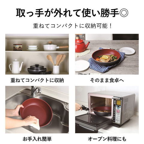 | ご注意:必ず専用のハンドルを使用してください。 電子レンジには使用しないでください。 つけ置き洗いや食器洗い乾燥機には使用しないでください。 金属ヘラOK※角の丸いなめらかなものをご使用ください。 レンタル等による貸出、オークション等による販売や中古販売、及び譲渡によって発生した故障・破損・損害・事故などにつきましては一切責任を負いかねますので予めご了承ください。 |