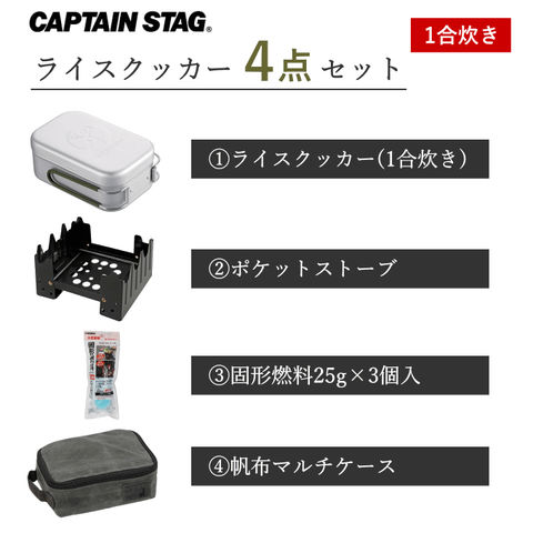 品番:P01-1-60-UH-4113-4P※品名:ライスクッカー 4点セット メスティン セット 1合炊き クッカー 飯盒 炊飯 クライム ストーブ 固形燃料 収納ケース コンパクト ソロ キャンプ めし UH-4113+3 キャプテンスタッグ