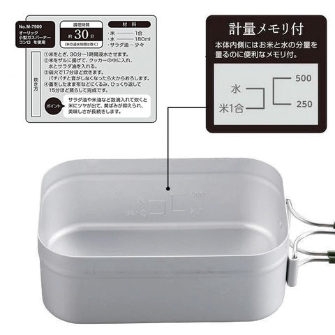 | 【ライスクッカー】満水容量(約)/1.0L 【固形燃料】使用方法はパッケージに書いてあります。使用上の注意をよく読んでご使用ください。 |
