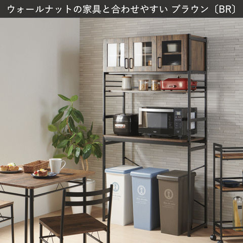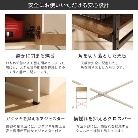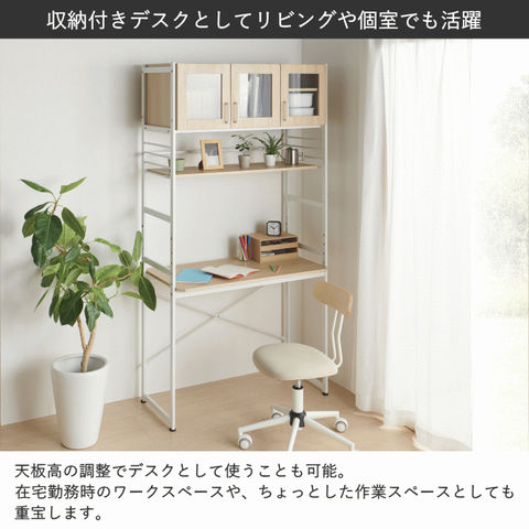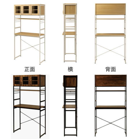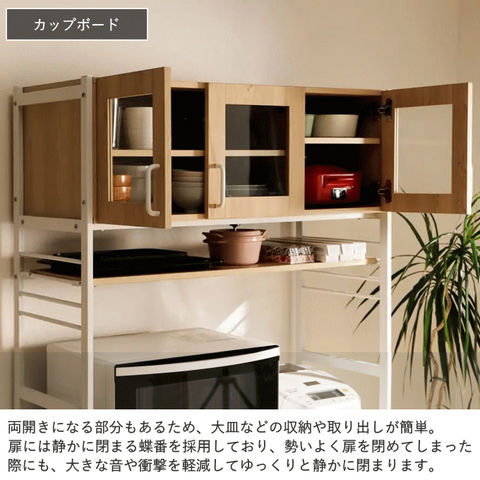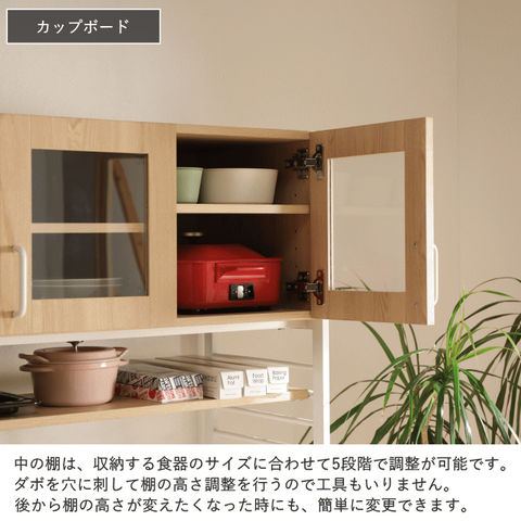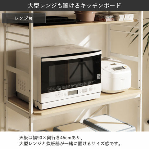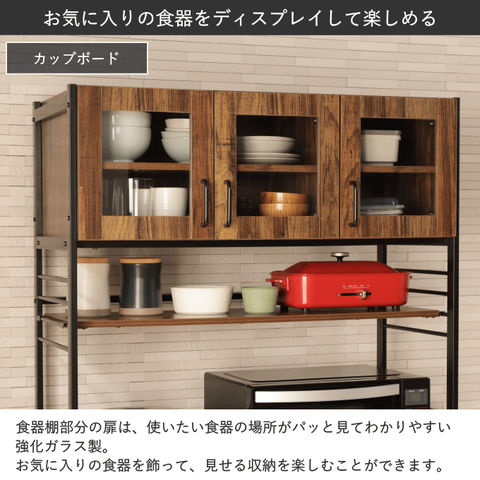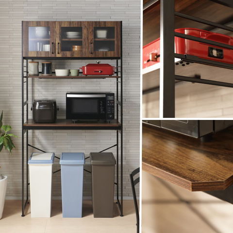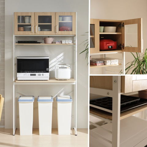 | キッチンやリビングのデッドスペースを有効活用して、調理家電や食材ストックを機能的でシンプルにまとめるキッチンラック。 悩めるキッチン収納の救世主です。ヘルシオサイズも収納できます。 【天板】幅95×奥行45cm 天板高さは、家電やゴミ箱(収納商品)サイズに合わせて、5段階調整可能。(50mmピッチ)(高さ70~90cm) 天板高さを調整出れば、デスクとして使用する事も可能です。 【カップボード下可動棚】幅89.5×奥行30cm カップボード下可動棚は、キッチン周りの小物収納として便利。 4段階調整可能。(40mmピッチ) 【カップボード】 食器棚部分の扉は、使いたい食器の場所がパッと見てわかりやすい強化ガラス製。 お気に入りの食器を飾って、見せる収納を楽しむことができます。 5段階調整可能。(32mmピッチ) 【水や汚れに強い素材】 板材は、メラミン化粧板を使っています。 傷や熱に強く、 汚れは拭き取るだけで簡単掃除か出来ます。 |