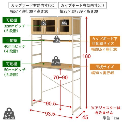 | 【全体】幅93.5×奥行45×高さ180cm(アジャスター含む/幅95.5×奥行47×高さ180cm) 【天板】幅95×奥行45cm 【カップボード下可動棚】幅89.5×奥行30cm |