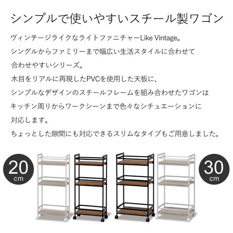| ビンテージ調のリアルな木目柄PCVを天板に採用したホームワゴン。 シンプルだからコーディネートしやすいデザイン。 キッチンやリビングスペースなど、いろいろなシーンで活躍します。 |
