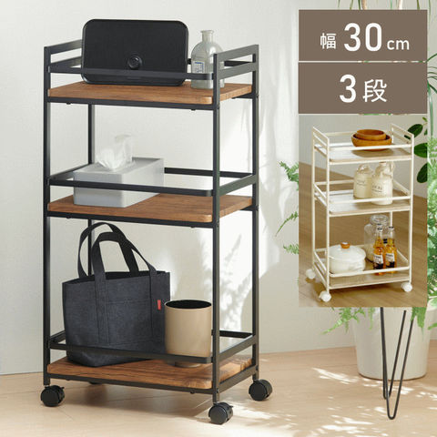 品番:K02-3-140-VWG-300BR※品名:スリム ワゴン キャスター付き 30cm 3段 棚 スリムワゴン マルチワゴン スリムストッカー キッチンストッカー キッチンワゴン キャスター付きワゴン 隙間収納 木製 天板付き スリム 収納 VWG-300