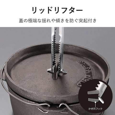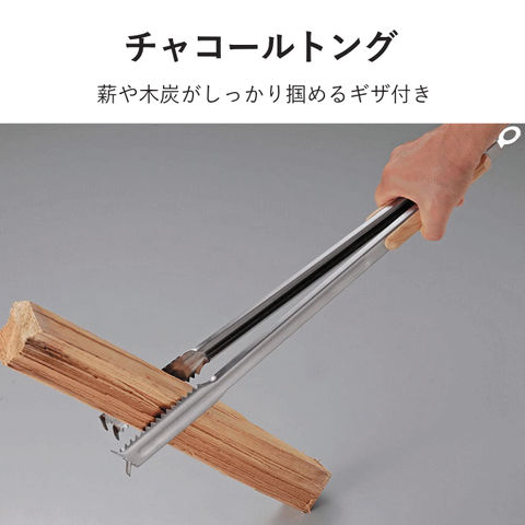 | 炭バサミ&リッドリフター 1台2役 蓋の極端な揺れや傾きを防ぐ突起付 薪や木炭がしっかりつかめるギザ付 開閉ラクラク 収納に便利なストッパー付き |