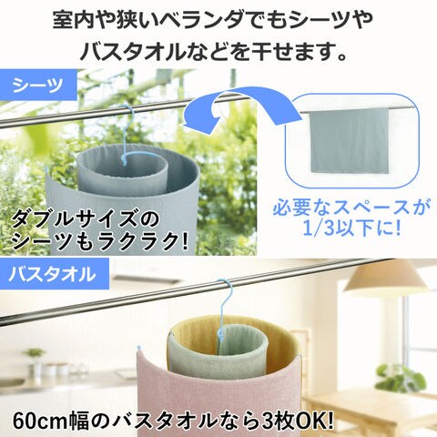 | 室内や狭いベランダでもシーツやバスタオルなどを干せます。 ダブルサイズのシーツもラクラク!必要なスペースが1/3に! 60cm幅のバスタオルなら3枚OK! |