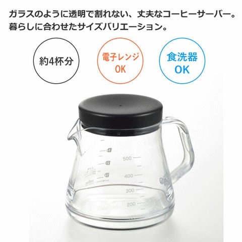 | ガラスのように透明で割れない、丈夫なコーヒーサーバー。 暮らしに合わせたサイズバリエーション。 ※お湯は沸かせません。コーヒーを温める際にのみ電子レンジを使用できます。 ●約4杯分 ●電子レンジOK ●食洗器OK |