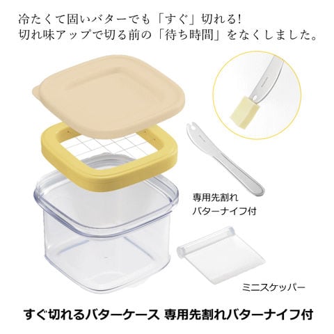 | 冷たくて固いバターでも「すぐ」切れる!切れ味アップで切る前の「待ち時間」をなくしました。 ●カットしたバターが取り出しやすく、ケースにすっきり収納できる専用先割れバターナイフ付。 ●収納しやすいコンパクトな保存ケース。バターが酸化しにくい、密閉タイプぬフタです。 ●1ピース約5gにカットできます。(200gのバターを使用した場合) |
