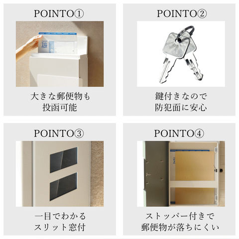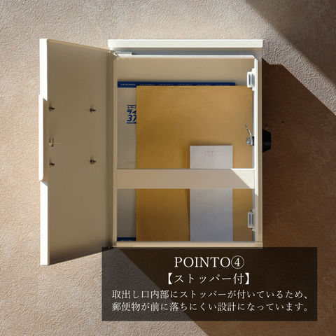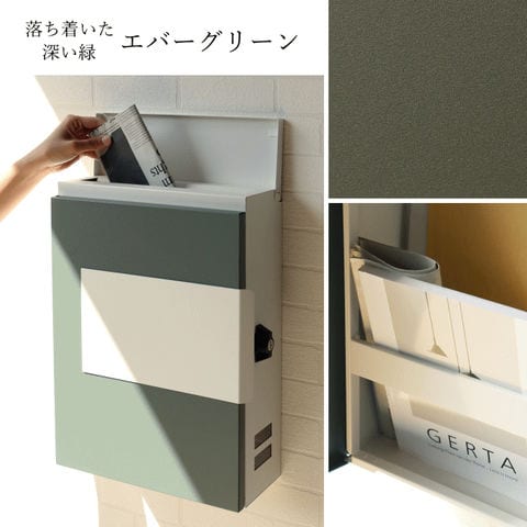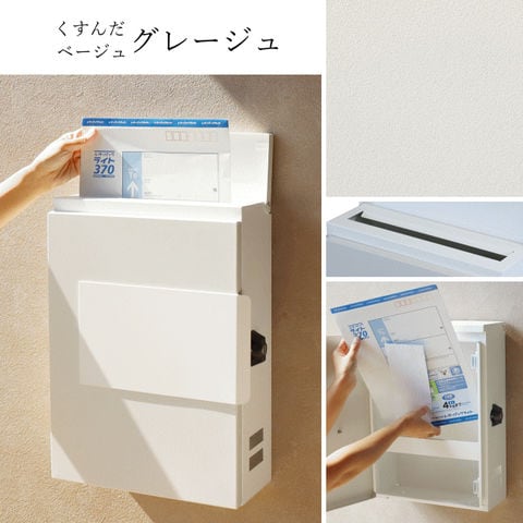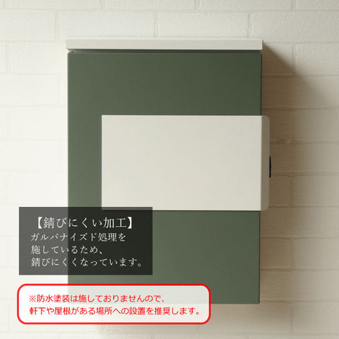 | 【大きな郵便物も投函可能】 茶封筒角型2号やレターパックライトなど大きな郵便物も投函可能。 【セキュリティ-】 鍵付きなので防犯面に安心です。また、スペアキーが1本付属しています。 【スリット窓付】 側面下部にスリット窓が付いているため、扉を開かなくても郵便物が投函されているのか確認可能です。 【持ち手付】 取り出し口に持ち手が付いているため、扉の開閉がし易くなっています。 【ストッパー付】 取り出し口下部にストッパーが付いているため、郵便物が前に落ちにくい設計になっています。 【カラー】 取出口扉カラーは、落ち着いた深い緑のエバーグリーンとくすんだベージュのグレージュからお選びいただけます。また、本体カラーは相性の良いホワイトカラーを使用しています。 ※防水塗装は行っていないので、軒下や屋根がある場所への設置を推奨します。 |