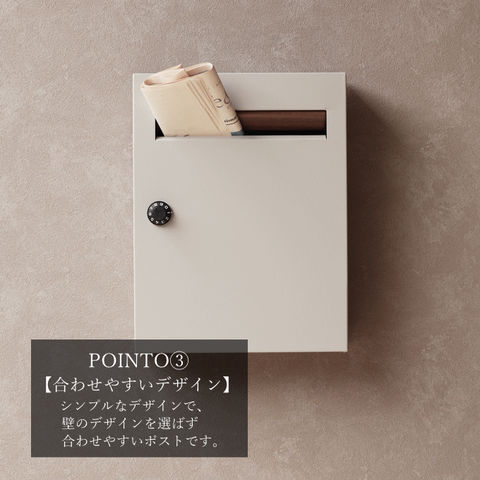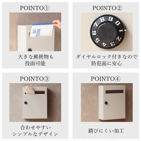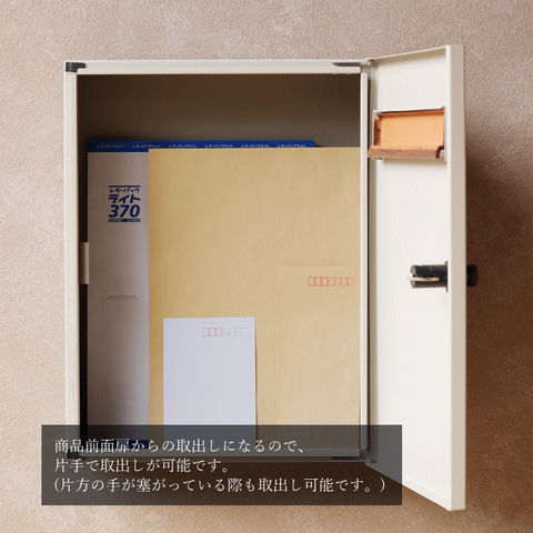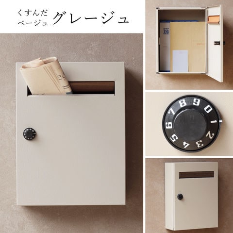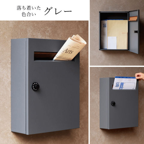 | 【大きな郵便物も投函可能】 茶封筒角型2号やレターパックライトなど大きな郵便物も投函可能。 【セキュリティ-】 ダイヤルロック付きなので防犯面に安心です。※お客様で好きな番号へ変更できません。 【デザイン】 シンプルなデザインで、壁のデザインを選ばず合わせやすいポストです。 【カラー】 カラーは、落ち着いた色合いのグレーとくすんだベージュのグレージュからお選びいただけます。また、投函口には相性の良いブラウン系の木目を採用しています。 商品前面扉からの郵便物の取出しになるので、片手で取出しが可能です。(片方の手が塞がっている際も取出し可能。) ※防水塗装は行っていないので、軒下や屋根がある場所への設置を推奨します。 |
