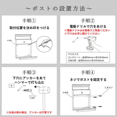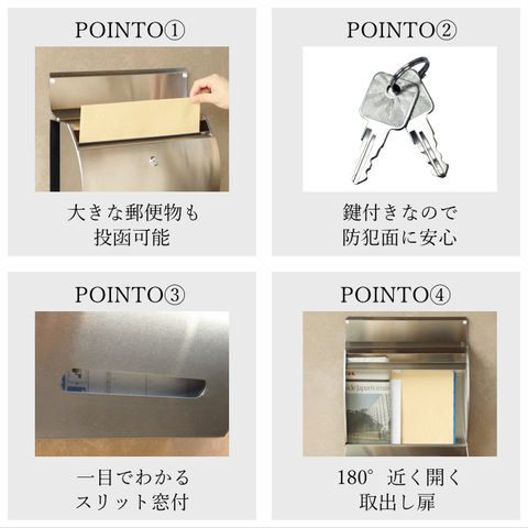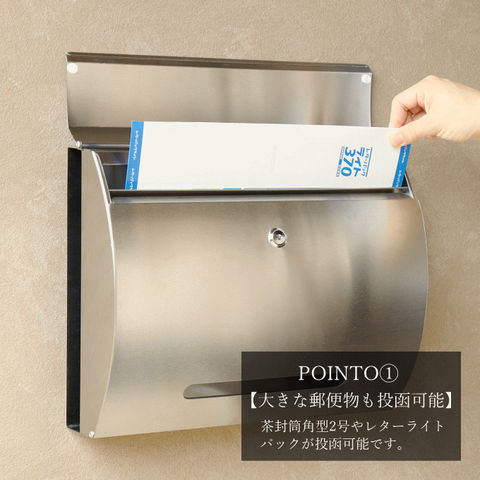 | 【大きな郵便物も投函可能】 茶封筒角型2号やレターパックライトなど大きな郵便物も投函可能。 【セキュリティ-】 鍵付きなので防犯面に安心です。また、スペアキーが1本付属しています。 【スリット窓付】 前扉の下部にスリット窓が付いているため、鍵を開けなくても郵便物が投函されているのか確認可能です。 【デザイン】 郵便取出し扉は180度近く開き、郵便物の取出しを楽々行えます。 前扉がR加工のデザイン性に優れた商品です。 ※防水塗装は行っていないので、軒下や屋根がある場所への設置を推奨します。 |