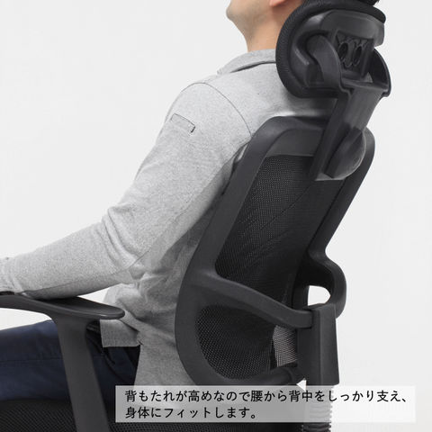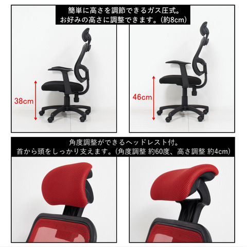 | 簡単に高さを調節できる、ガス圧式。 角度調節ができるヘッドレスト付、首から上をしっかり支えます。 背もたれが高めなので腰から背中をしっかり支え、身体にフィットします。 調節ねじを回してロッキングの固さを調節できます。 肘置きがあるので、ゆったりとリラックスできます。 背もたれ・座面はメッシュ素材で、通気性が良くサラッと快適です。 |