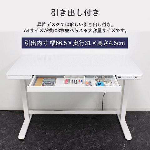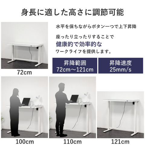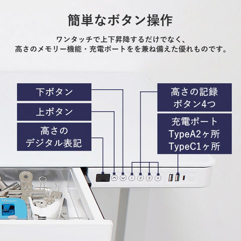 | 組立品 高さのメモリー機能付(最大4つまで可能) 高さのデジタル表記 充電ポート付(TypeA2ヶ所、TypeC1ヶ所) 昇降速度:25mm/s 定格電圧:100-240V 【安全機能】 ・高さのロック機能 ・障害物の感知機能(感知レベル3段階) |