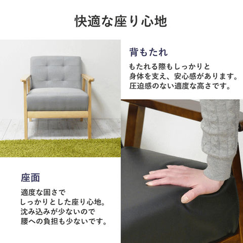 | 温もりを感じる天然木フレームの肘が雰囲気あるお洒落でシンプルでコンパクトなソファです。自分だけの空間をゆったり過ごすことができる一人用ソファ! 【肘掛け】 天然木の木目が美しい肘掛け。角は丸く加工していますので安心です。 【座面】 適度な固さでしっかりとした座り心地。沈み込みが少ないので腰への負担も少ないです。 【背もたれ】 もたれる際もしっかりと体を支え、安心感があります。圧迫感のない適度な高さです。 【脚裏】 床へのキズ防止のためにフェルトを貼っています。 【脚高】 床からソファ下までの高さは約19cm。ロボット掃除機が楽々入る高さです。 |